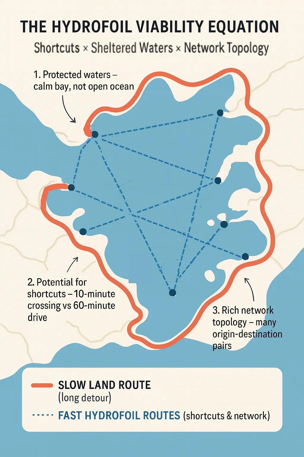 But as an outside observer, I’m less sanguine than they are that this is a universal technology. In my view, most coastal cities are poor candidates for hydrofoil transit, and no amount of technological improvement changes that, because the geography is fundamentally inappropriate. Viable hydrofoil markets need three conditions simultaneously, and most places fail on at least one.