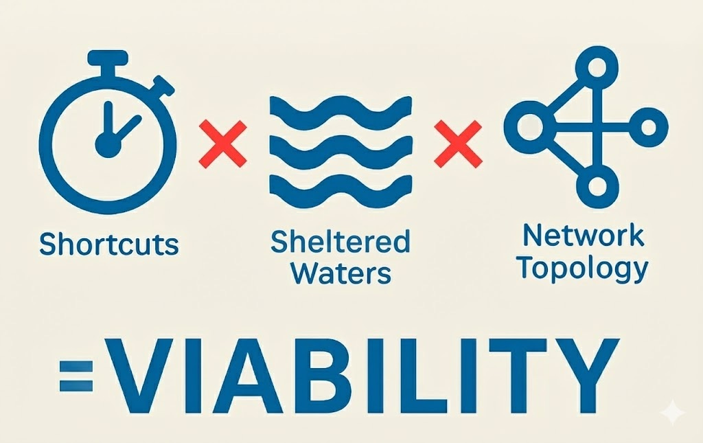 To be equally clear, Navier disagrees with me on this point. As far as urban marine transport goes, they see a hundred or more viable markets where I see fifteen to twenty-five. That gap reflects both definitional differences and genuine analytical disagreement. Navier’s count appears to include seasonal resort destinations, island lifelines, and intercity marine corridors that fall outside my focus on year-round, networked urban commuting. It also reflects a different weighting of factors: Navier places more emphasis on time certainty and ride comfort in the absence of large geometric shortcuts, whereas I treat those features as necessary but usually insufficient on their own.