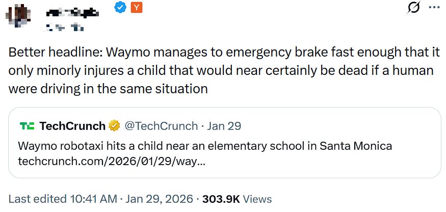 A child was struck by a Waymo near a school on a Friday morning during drop-off, and the company’s response was that it hit her less hard than someone else might have. So was this a success, or a failure? The answer is: it depends on the standard we apply.