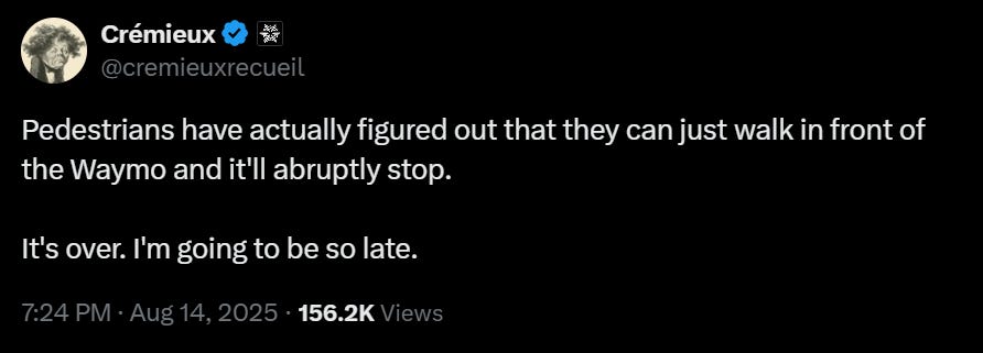 Phoenix is already seeing edge cases. Pedestrians, cyclists, even other drivers are beginning to learn that an AV will not assert its right of way. The social equilibrium of the street is fragile, and relies on mutual recognition of risk. Remove one party's exposure to that risk, and the counterparty can be exploited. The more people understand this, the more exploitation there will be.